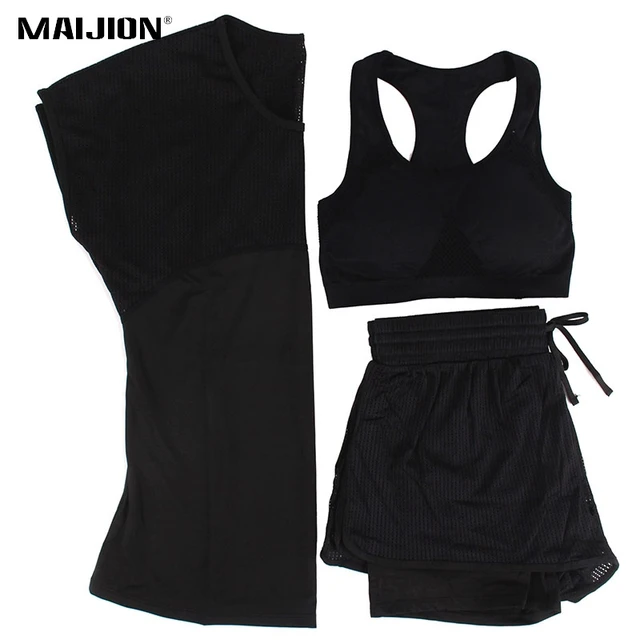 MAIJION 3Pcs Women Sports Running Set Yoga T Shirt Tops&Shorts&Bra Set Quick Dry Gym Fitness Yoga Set Workout Sportswear Suit